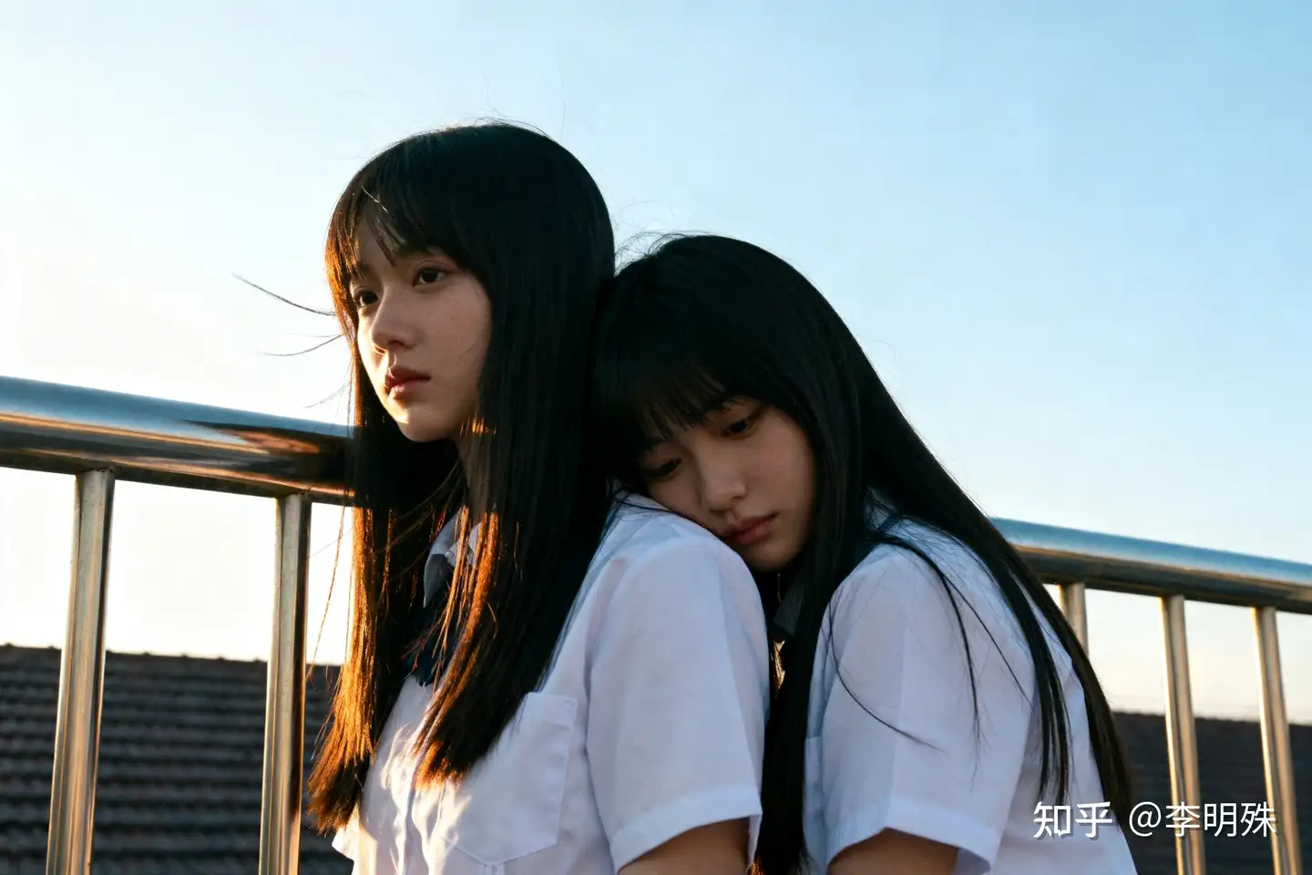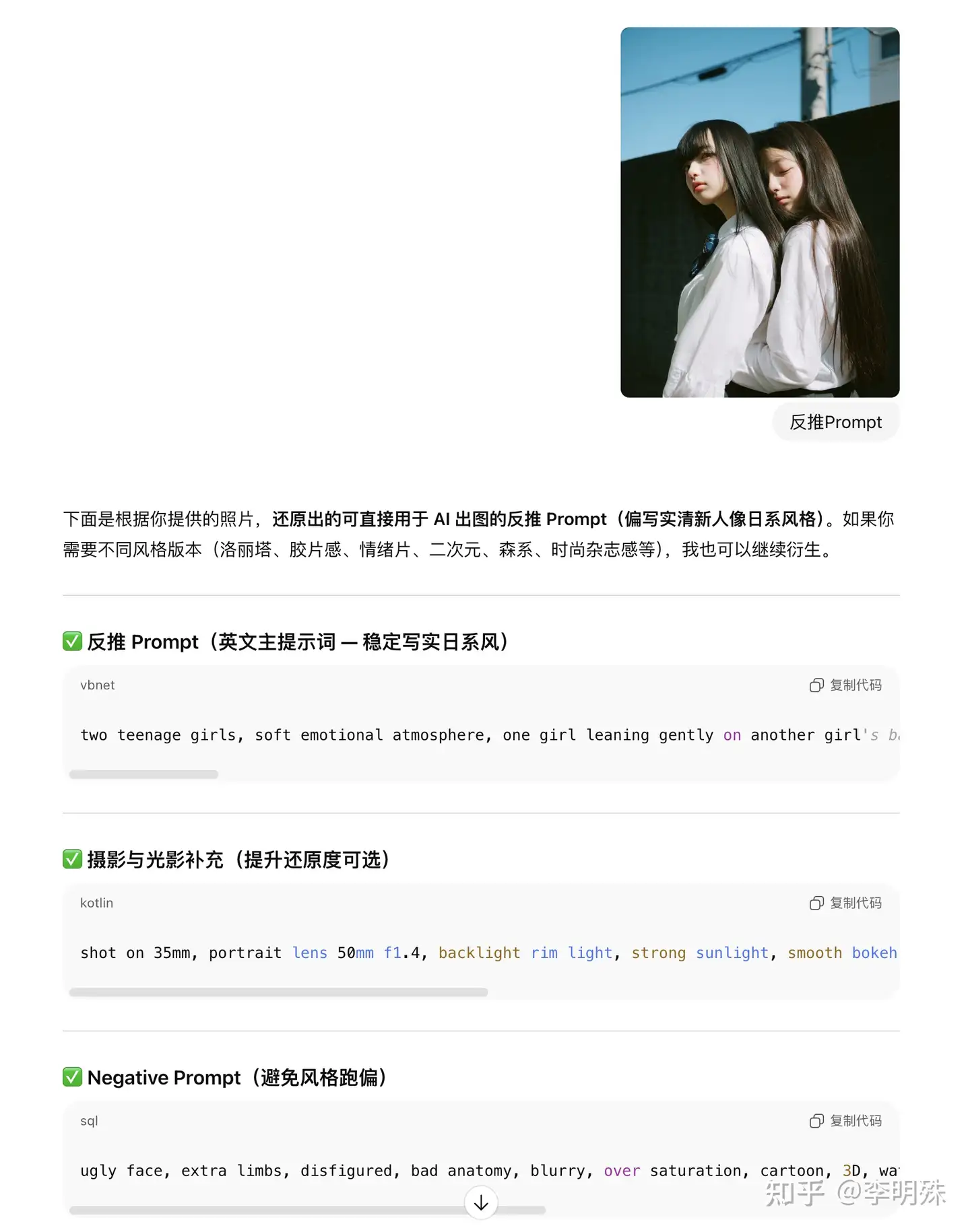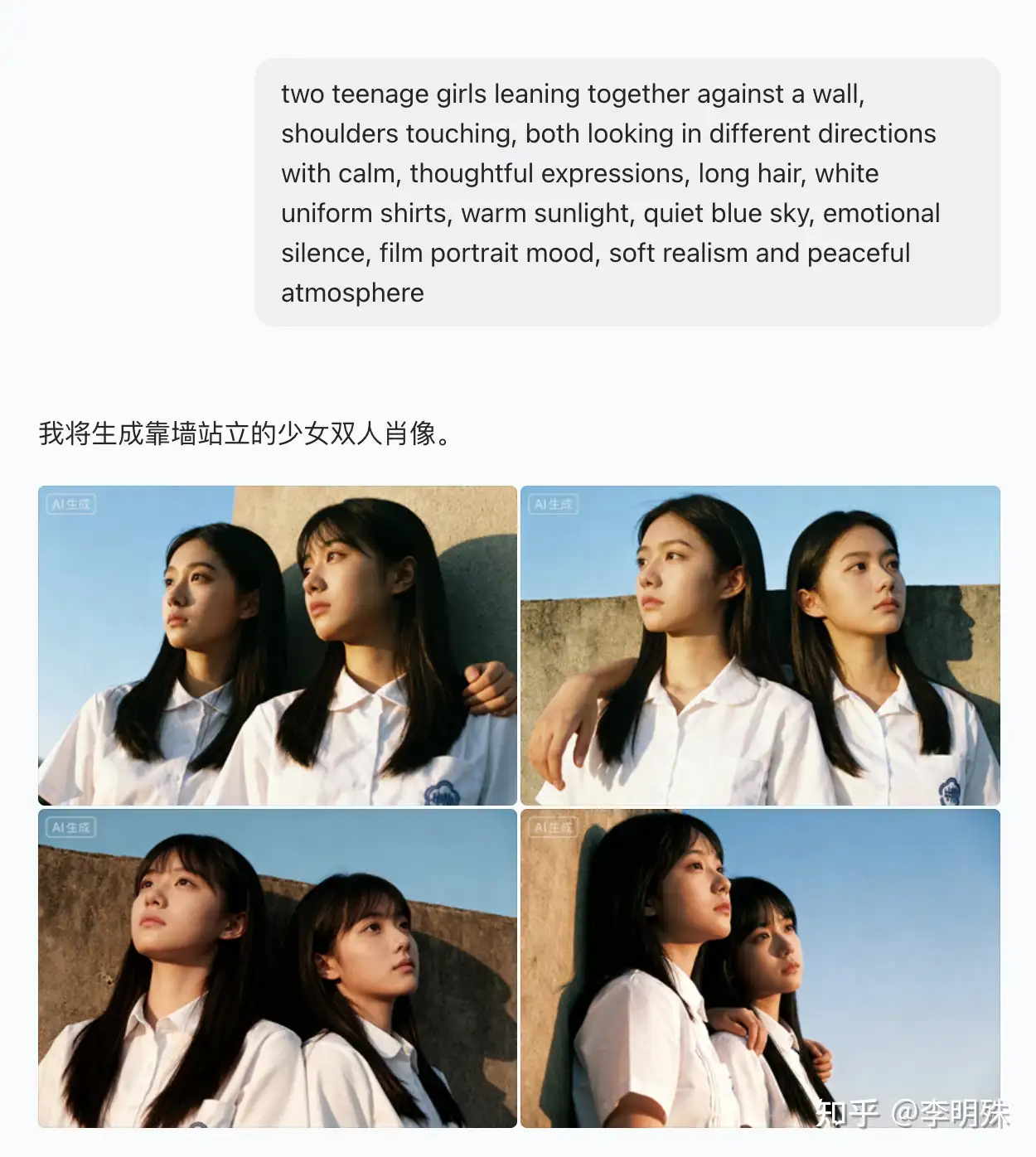 在网上看到了一张两个 JK 女孩的合影(实际上这张图也是 AI 的),觉着很好看,于是就把它扔到了 ChatGPT里边,顺便说了五个字 ——