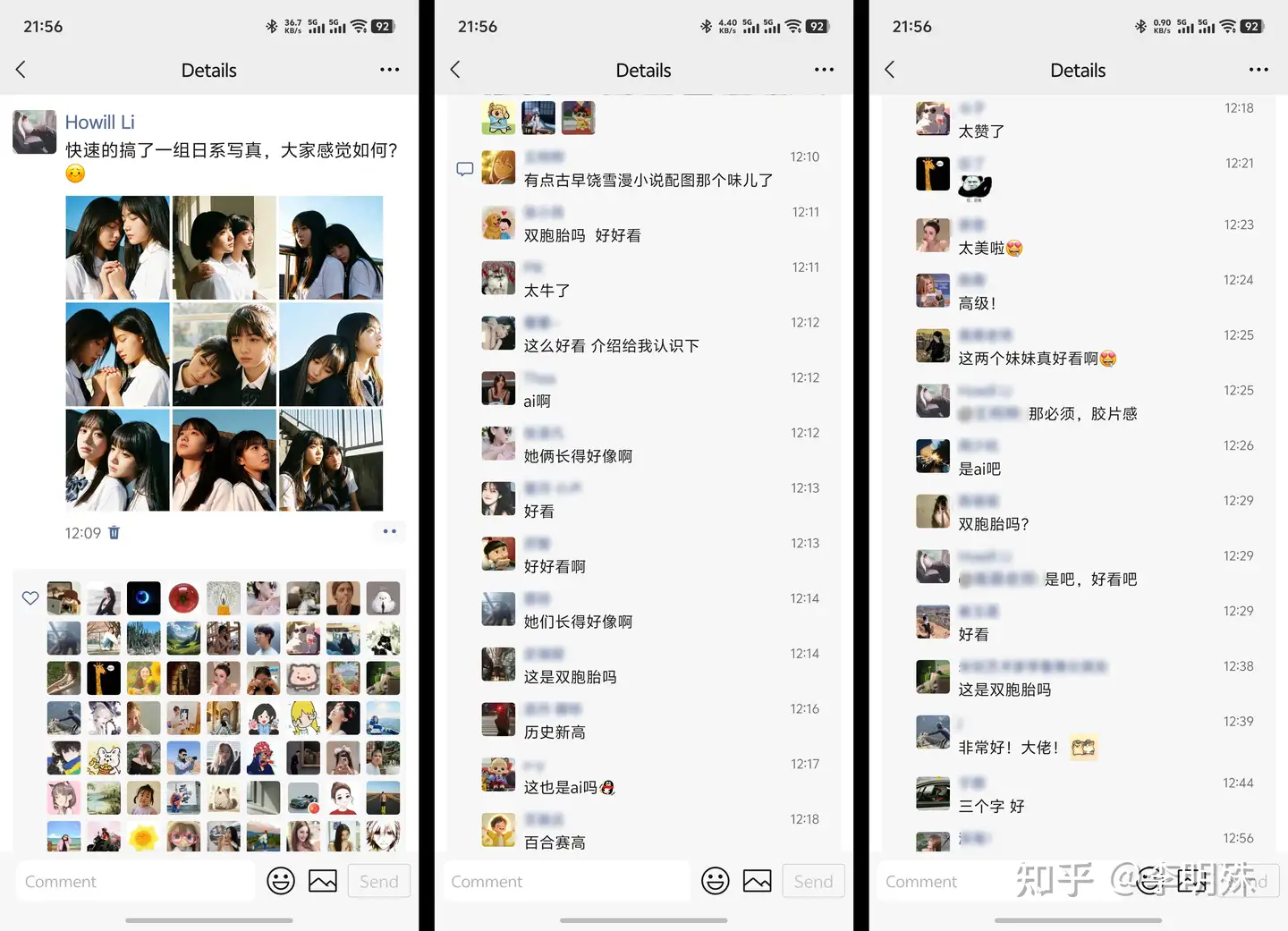 我还把发发到各个摄影群里,大家会问我用的什么相机,怎么打的光,哪里找到的模特,完全没有意识到这两个人压根不存在,只有很少一部分人意识到这是 AI 的,如果不是我之前总在群里分享有关 AI 的内容,估计这部分人也不会猜到。