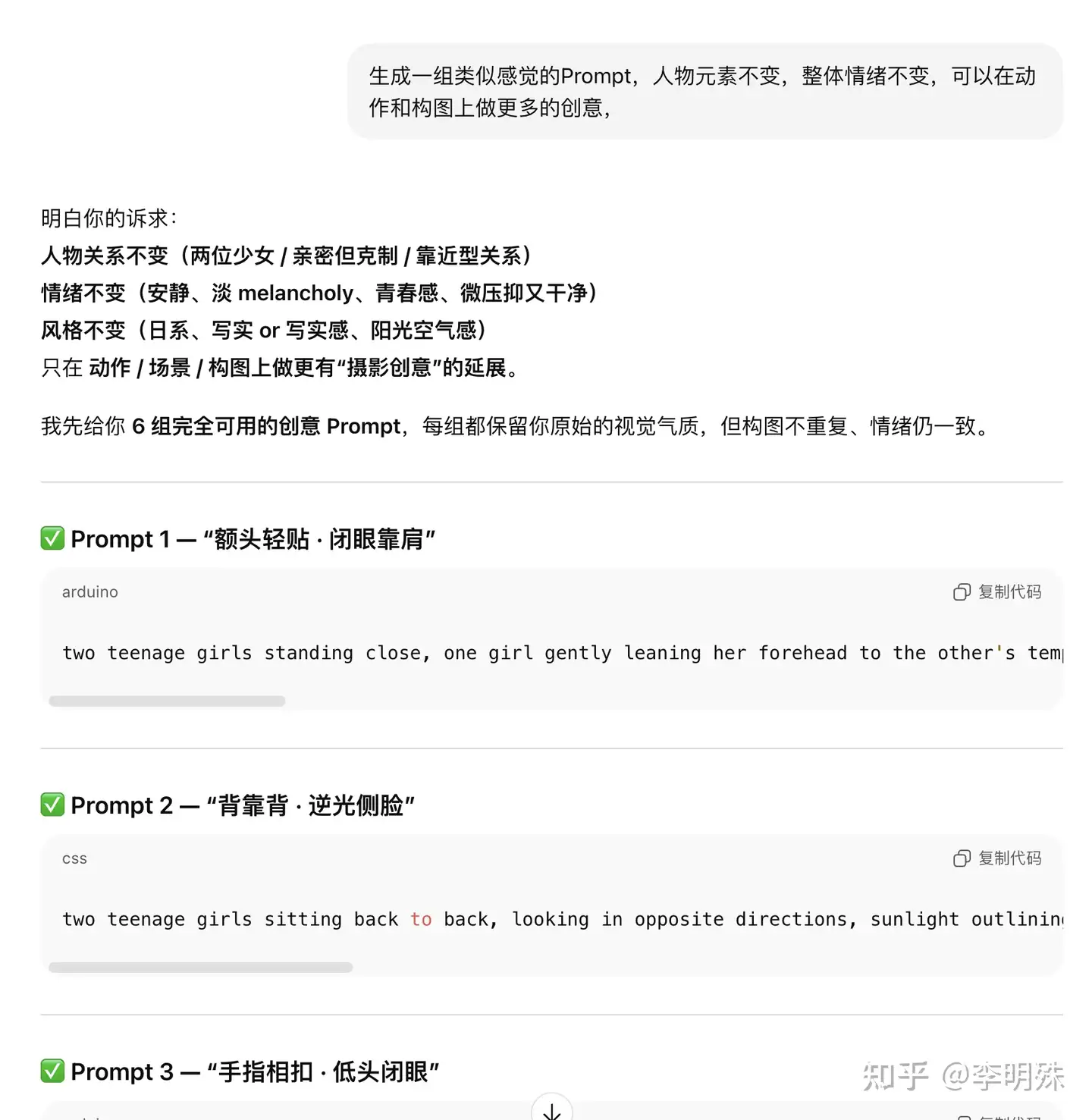 生成一组类似感觉的Prompt,人物元素不变,整体情绪不变,可以在动作和构图上做更多的创意。